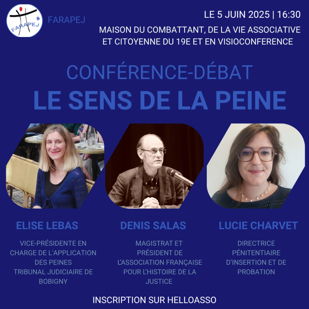 Le 5 juin 2025 la Farapej a organisé en présentiel et en visioconférence une conférence-débat dont le thème était « le sens de la peine » avec Denis Salas Magistrat, auteur, historien, Lucie Charvet Directrice pénitentiaire d’un Service d’insertion et de probation et Elise Lebas, Juge, vice-présidente en charge de l’application de peines au tribunal judiciaire de Bobigny.